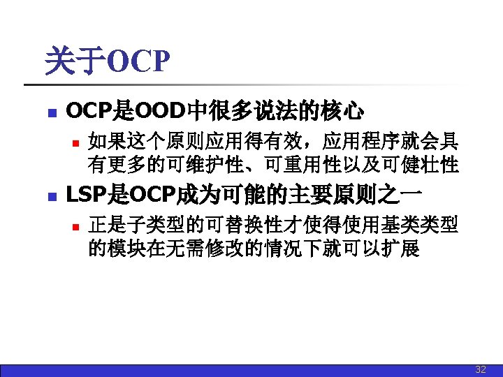 新的需求…… 需要手去开关冰箱……? ü为冰箱实现Excutable接口 ü不需要修改任何原有的设计 和代码 public class Refrigerator implements Excutable { private boolean _is. Open = false; public boolean is. Open() { return _is. Open; } public void open() { _is. Open = true; } public void close() { _is. Open = false; } 31 }