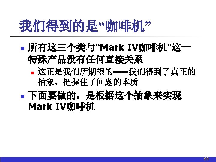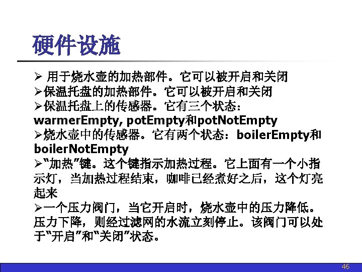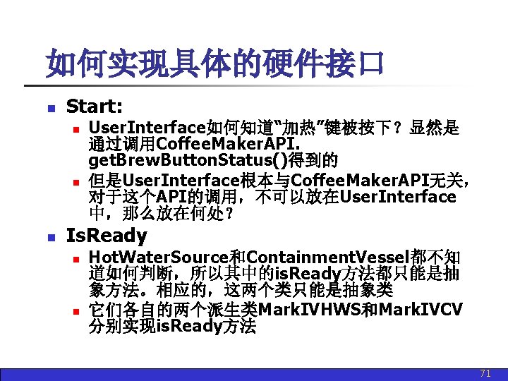 相关API-1 /** *@(#)Coffee. Maker. API. java */ public interface Coffee. Maker. API { public static Coffee. Maker. API api = null; /** * 此函数返回保温托盘的传感器状态。该传感器判断 * 咖啡壶是否放置在其上,以及壶中是否有咖啡。 */ public int get. Warmer. Plate. Status(); public static final int WARMER_EMPTY = 0; public static final int POT_EMPTY = 1; public static final int POT_NOT_EMPTY = 2; /** * 此函数返回烧水壶开关的状态。该开关是一个浮力 * 开关,可以检测到壶中的水是否还多于1/2杯。 */ public int get. Boiler. Status(); public static final int BOILER_EMPTY = 0; public static final int BOILER_NOT_EMPTY = 1; 47