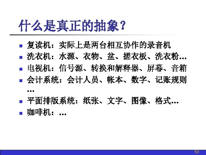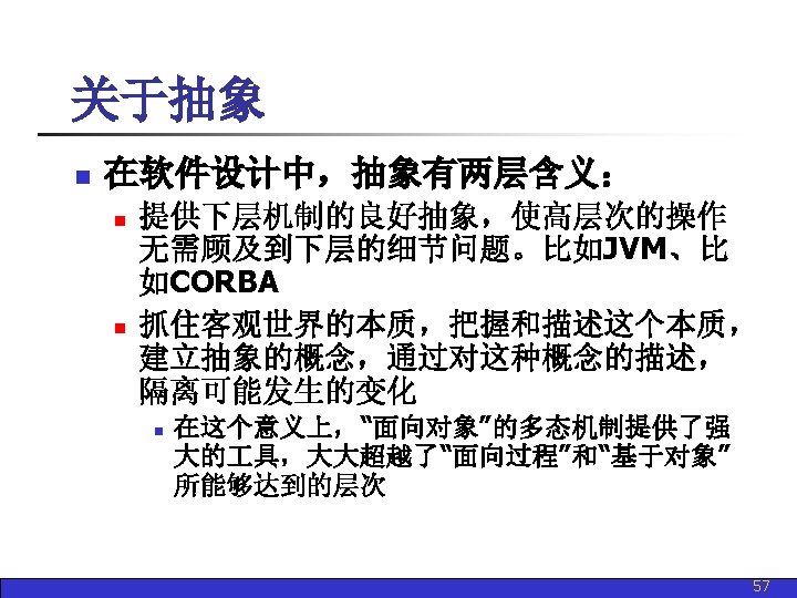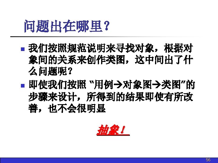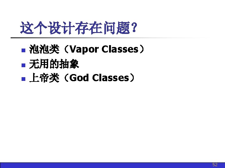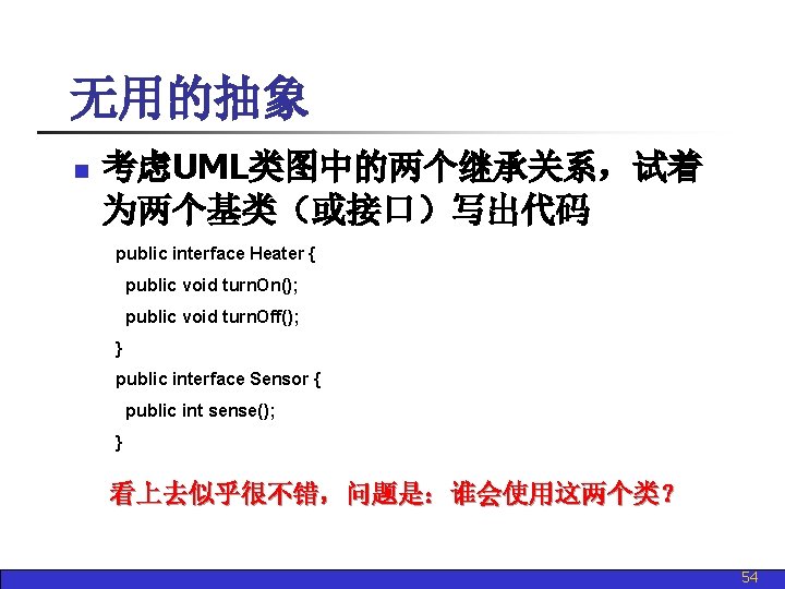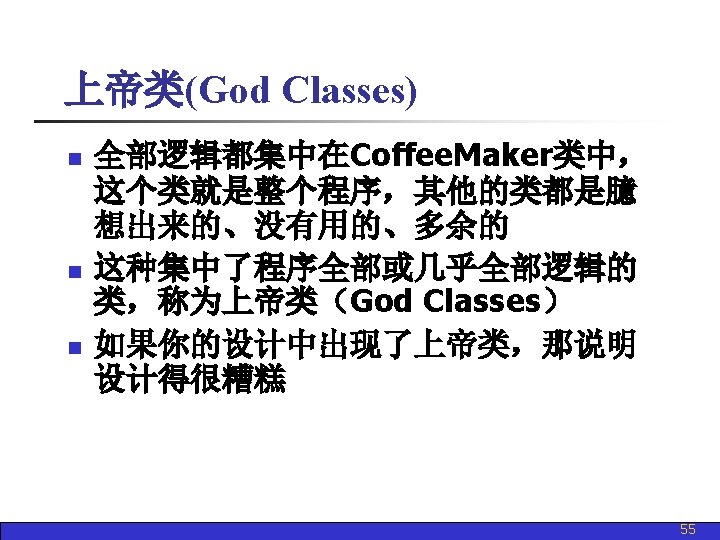 泡泡类(Vapor Classes) n n 所谓泡泡类,就是没有带来任何好处的类。 考虑Light类: public class Light { public void turn. On() { Coffee. Maker. API. api. set. Indicator. State(Coffee. Maker. API. INDICATOR_ON); } public void turn. Off() { Coffee. Maker. API. api. set. Indicator. State(Coffee. Maker. API. INDICATOR_OFF); } } 这种类的存在似乎是只是让代码变得简洁好看一些 从实际作用来看,毫无价值 53