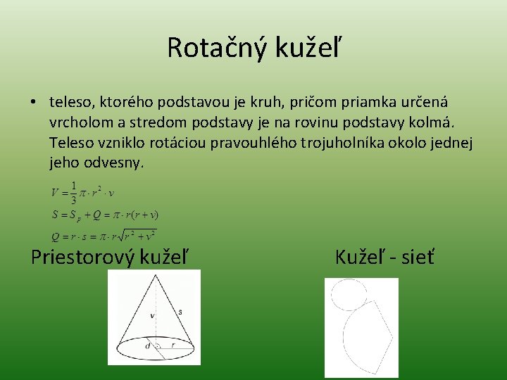 Rotačný kužeľ • teleso, ktorého podstavou je kruh, pričom priamka určená vrcholom a stredom podstavy je na rovinu podstavy kolmá. Teleso vzniklo rotáciou pravouhlého trojuholníka okolo jednej jeho odvesny. Priestorový kužeľ Kužeľ - sieť