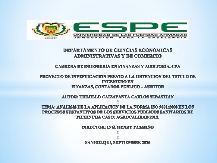 * Objetivo general * Analizar las implicaciones de la norma ISO 9001 -2008 en servicios públicos sanitarios de la provincia de Pichicha. Objetivos específicos * Analizar el impacto de la aplicación de la norma ISO 90012008 en los procesos técnicos de AGROCALIDAD. * Analizar y revisar las bases teóricas que sustentan la presente investigación. * Indagar la situación actual del sector en que se desenvuelven las instituciones públicas que brindas servicios sanitarios en la provincia de Pichincha. * Realizar un análisis empírico de AGROCALIDAD y los procesos sustantivos certificados por la ISO 9001 -2008.