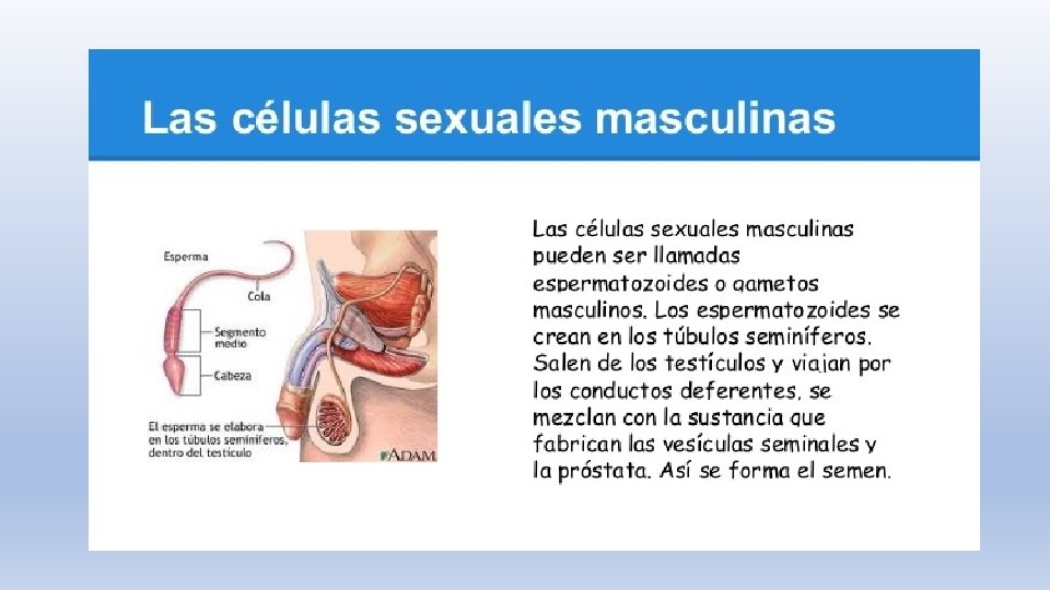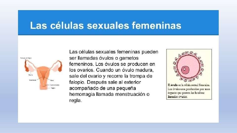 Semejanzas y diferencias entre las células sexuales femeninas y masculinas. Ovocito 1. Gameto femenino. 2. Célula redondeada. 3. Se producen en la vida intrauterina , es decir, antes de nacer la niña. 4. Célula de mayor tamaño que el espermatozoide 5. Posee estructuras en sus membranas que le permiten desplazarse por los oviductos. 6. Contiene la mitad de la información genética (de la madre) y sustancias nutritivas. Espermatozoide 1. Gameto masculino. 2. Célula alargada con una cabeza pequeña donde se encuentra el núcleo con el ADN, un cuello y el flagelo. 3. Miles de veces más pequeño que el ovocito. 4. Debido al flagelo, posee mayor movilidad que el ovocito. 5. Contiene la mitad de la información genética (del padre) 6. Su formación comienza en la pubertad y se extiende hasta la etapa de vejez.