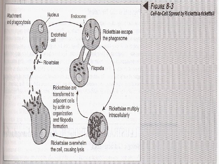 Rickettsia: Virulence Factors • Induced phagocytosis, intracelluular growth – protected from host immune clearance • Replicates in endothelial cells – cell damage, vasculitis • Recruitment of actin - intracellular spread