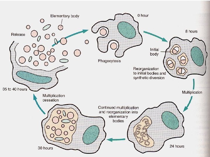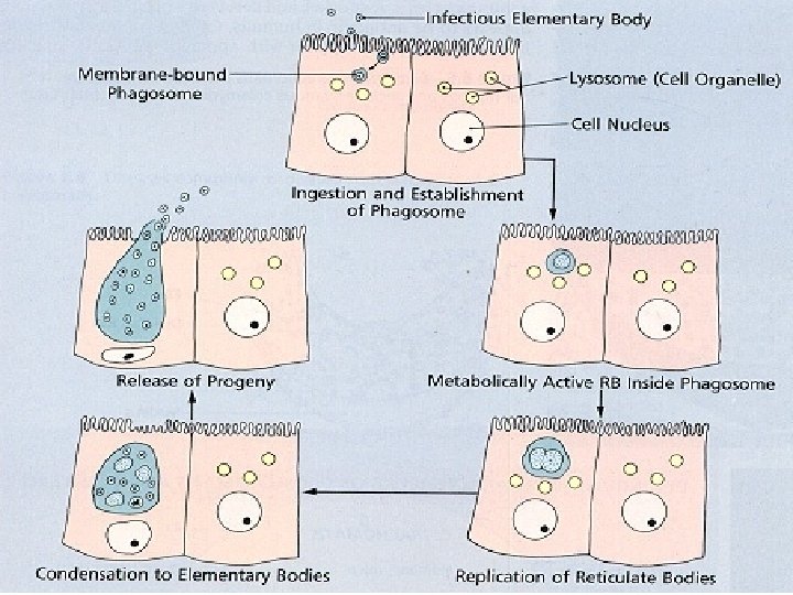 Chlamydia: Life Cycle – Reticulate Body (RB) • Noninfectious form, larger, less dense, 800 -1000 nm • Metabolically active • 8 -30 hours – – Synthesize new materials Multiply by binary division Form inclusion body Reorganize, condense into EB • 35 -40 hours - cell lyses, releases EB, begins cycle again