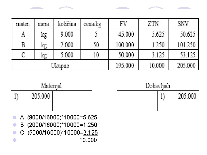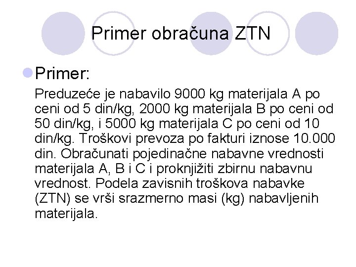Primer obračuna ZTN l. Primer: Preduzeće je nabavilo 9000 kg materijala A po ceni od 5 din/kg, 2000 kg materijala B po ceni od 50 din/kg, i 5000 kg materijala C po ceni od 10 din/kg. Troškovi prevoza po fakturi iznose 10. 000 din. Obračunati pojedinačne nabavne vrednosti materijala A, B i C i proknjižiti zbirnu nabavnu vrednost. Podela zavisnih troškova nabavke (ZTN) se vrši srazmerno masi (kg) nabavljenih materijala.