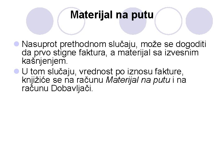 Materijal na putu l Nasuprot prethodnom slučaju, može se dogoditi da prvo stigne faktura, a materijal sa izvesnim kašnjenjem. l U tom slučaju, vrednost po iznosu fakture, knjižiće se na računu Materijal na putu i na računu Dobavljači.