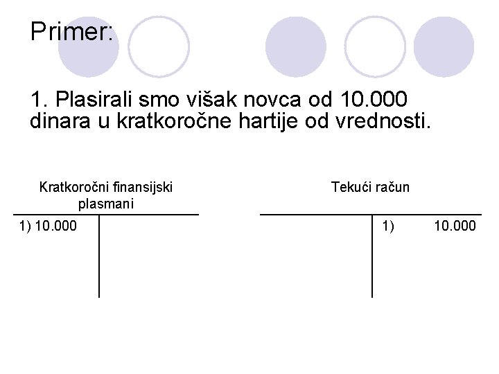 Primer: 1. Plasirali smo višak novca od 10. 000 dinara u kratkoročne hartije od vrednosti. Kratkoročni finansijski plasmani 1) 10. 000 Tekući račun 1) 10. 000