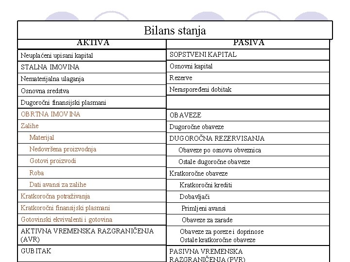 Bilans stanja AKTIVA PASIVA Neuplaćeni upisani kapital SOPSTVENI KAPITAL STALNA IMOVINA Osnovni kapital Nematerijalna ulaganja Rezerve Osnovna sredstva Neraspoređeni dobitak Dugoročni finansijski plasmani OBRTNA IMOVINA OBAVEZE Zalihe Dugoročne obaveze Materijal DUGOROČNA REZERVISANJA Nedovršena proizvodnja Obaveze po osnovu obveznica Gotovi proizvodi Ostale dugoročne obaveze Roba Dati avansi za zalihe Kratkoročne obaveze Kratkoročni krediti Kratkoročna potraživanja Dobavljači Kratkoročni finansijski plasmani Primljeni avansi Gotovinski ekvivalenti i gotovina Obaveze za zarade AKTIVNA VREMENSKA RAZGRANIČENJA (AVR) Obaveze za poreze i doprinose Ostale kratkoročne obaveze GUBITAK PASIVNA VREMENSKA RAZGRANIČENJA (PVR)