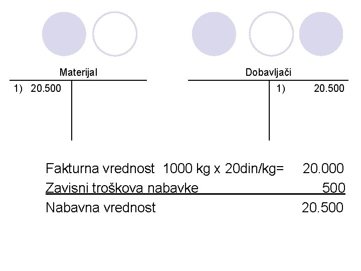 Materijal 1) 20. 500 Dobavljači 1) 20. 500 Fakturna vrednost 1000 kg x 20 din/kg= Zavisni troškova nabavke Nabavna vrednost 20. 000 500 20. 500