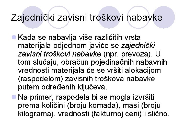 Zajednički zavisni troškovi nabavke l Kada se nabavlja više različitih vrsta materijala odjednom javiće se zajednički zavisni troškovi nabavke (npr. prevoza). U tom slučaju, obračun pojedinačnih nabavnih vrednosti materijala će se vršiti alokacijom (raspodelom) zavisnih troškova nabavke putem određenih ključeva. l Na primer, raspodela bi se mogla izvršiti prema količini (broju komada), masi (broju kilograma), vrednosti (fakturnoj ceni) i slično.