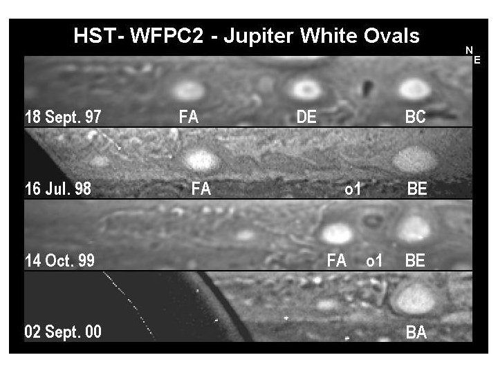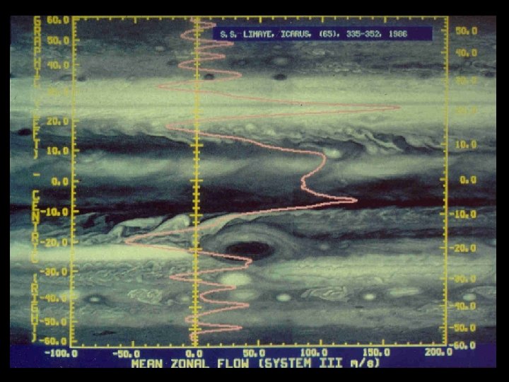 Rows of Anti-cyclones • Except for the Great Red Spot, the anticyclones do not occur as single vortices. • They occur in rows (at a constant latitude). • Each latitude corresponds to a peak of a westward jet (or just to its poleward side).