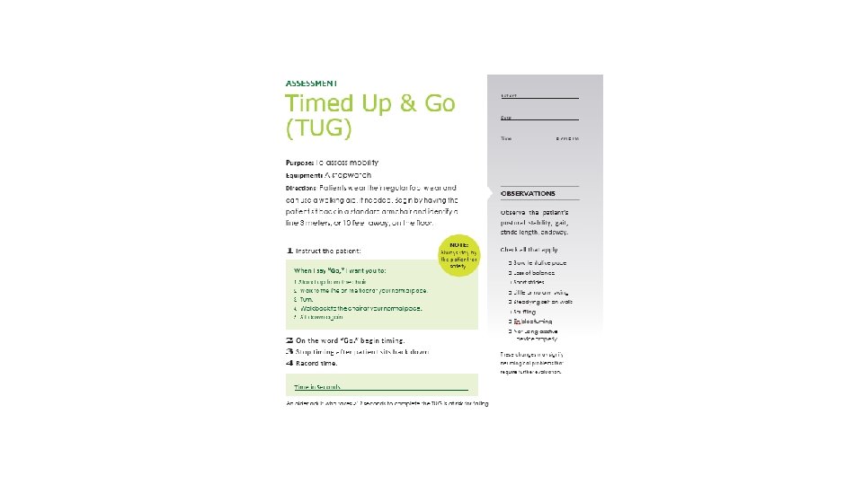 Assess Mobility • Screen for mobility and document • TUG • Get Up and Go • PT referral • Ensure early, frequent, and safe mobility