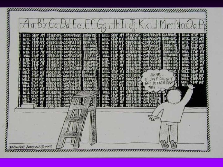 The many faces of OCD • Dermatologist: Chapped hands, eczema, Trichotillomania • Oncologist/Infectious disease: Hypochondriasis (Cancer, AIDS) • Neurologist: OCD associated with Tourette’s or other neurologic disorders • Obstetrician: OCD during pregnancy or postpartum • Pediatrician: Compulsive behavior, OCD secondary to Sydenham’s chorea, difficulty in school • Plastic surgeon: Body dysmorphic disorder • Dentist: Gum lesions from excessive teeth bleeding • Family practitioner: Report of family member washing or checking excessively, comorbid affective or anxiety disorders, all of the above.