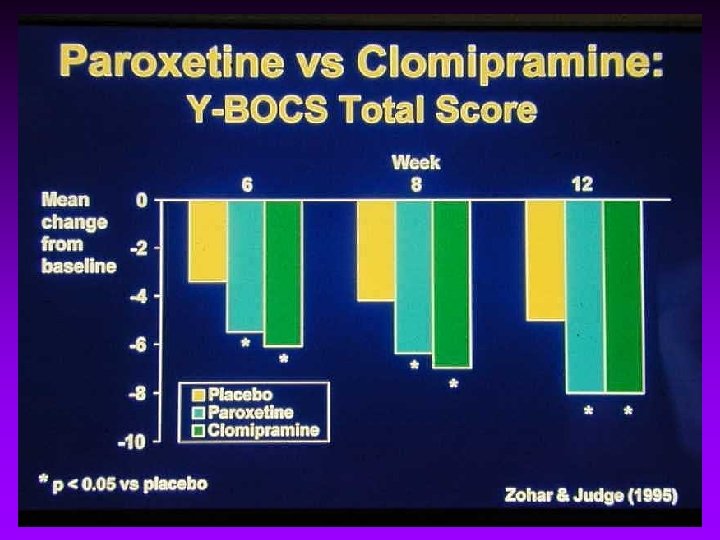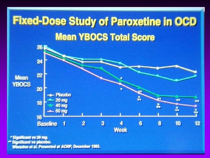 Fluoxetine vs Clomipramine • 20 week crossover • No difference between Y~BOCS • Delayed response to 2 nd drug • Relapse occurred during washout • <ADR with fluoxetine ADR = adverse drug reaction Pigott et al. Arch Gen Psychiatry, 1990; 47: 926 -932.