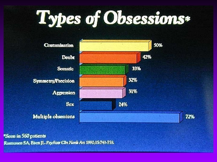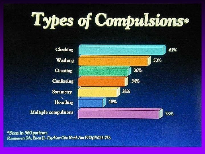 Epidemiology of OCD • 6 -month point prevalence: 1. 6% • Life-time prevalence: 2. 5% • An estimated 3. 9 million Americans had OCD in 1990 • 4 th most common psychiatric disorder • Double that of panic disorder or schizophrenia