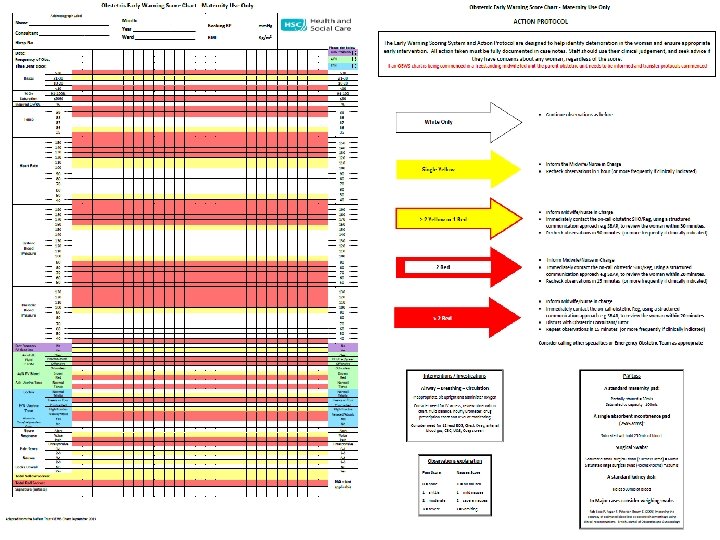 Regional OEWS Chart 2013 Early Warning Scoring System and Action Protocol for Early Pregnancy, Antenatal and Postnatal The colour trigger (yellow and red) is simple and visual. A numerical score is more complex Red is the colour denoting serious patient condition requiring urgent action Yellow is the colour suggesting that the patient condition is worsening requiring escalation of treatment Balance between too much information on a chart causing distraction and maximising useful variables recorded