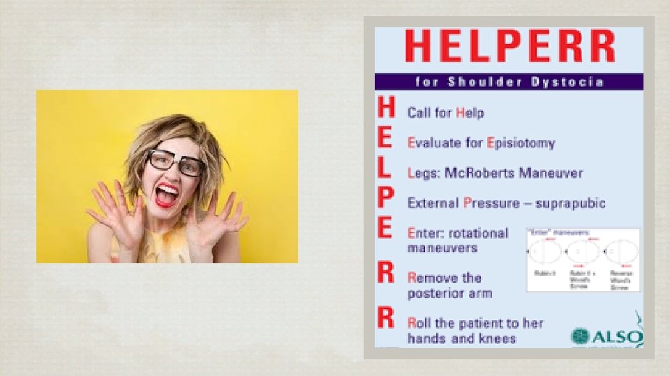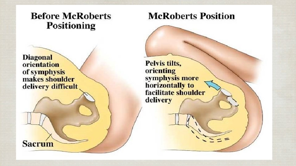 Management • Call for help : Nurse, Staff OB, Anas, Peds • Widening episiotomy, Empty bladder • Mc Roberts’ maneuver • Suprapubic pressure o Rotational maneuver o Posterior arm extraction o All four o Cleidotomy o Zavanelli, Symphysiotomy, Hysterotomy