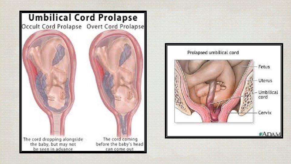 Umbilical cord prolapse • Associated with abnormal lie, presentation • Unengaged fetal head • Abnormal fetal heart after membrane rupture • Pulsatile cord