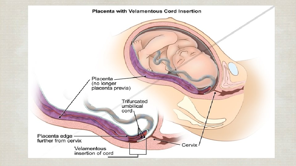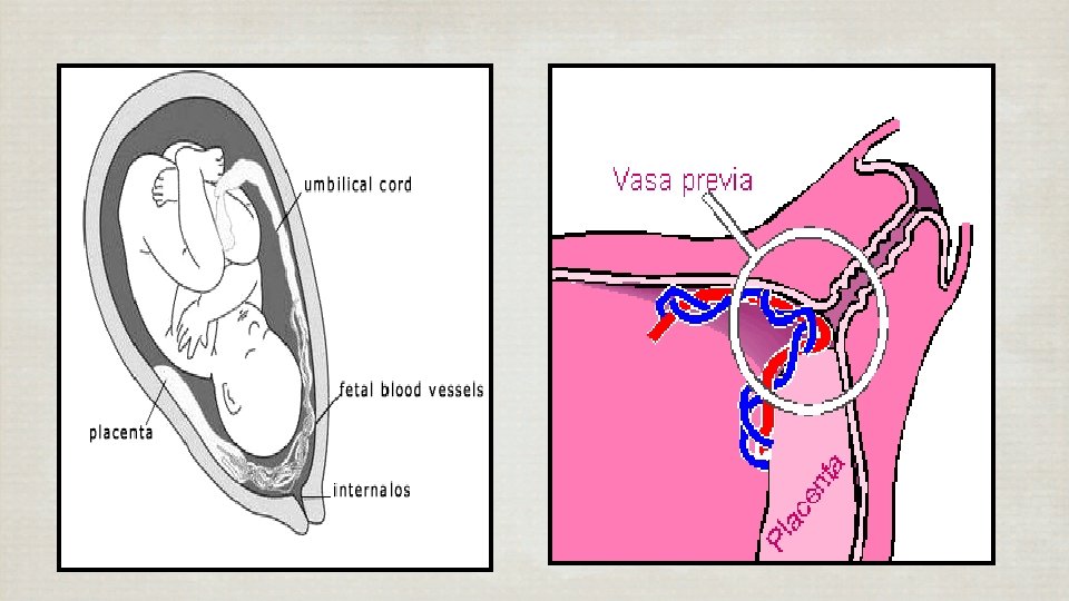 Vasa Previa : Fetal Vessels run through the amniotic membranes over the internal os rare, 1 : 10, 000 : Common with - Velamentous insertion - Low lying placenta : Fetal heat rate abnormalities after Membranes rupture : Perinatal mortality 50 – 60 %