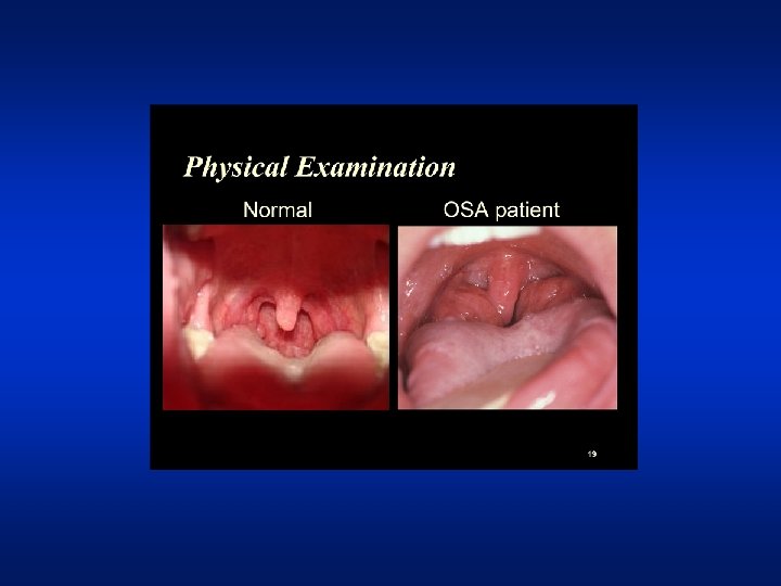 OSA Risk Factors • Obesity; Neck circumference • Post menopausal state • Craniofacial abnormalities • Nasal deformities • Narrow posterior pharynx • Late night alcohol, sedatives