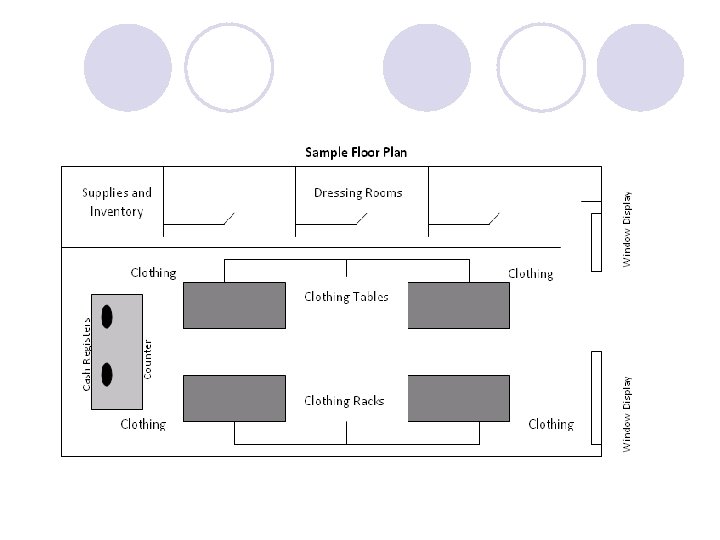 ` 4. Use common sense when organizing the merchandise in your store- customers should easily find what they want 4. 5. 6. 7. 8. Inventory and supplies should be well organized Leave at least four feet of aisle space- makes it easy to move around in the store Create attractive in-store displays- customers are drawn to displayed merchandise Use wall space wisely- use space that is too high to reach for displays Place the cash register in a central locationcustomers shouldn’t have to search for a cashier