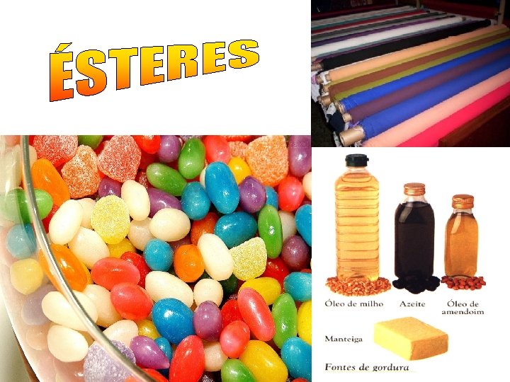 Óleos e gorduras: são os ésteres mais usados em nosso dia-a-dia, são encontrados em produtos como óleo de soja, margarina e azeite de oliva. Ceras: usadas na fabricação de graxas para sapatos, cera para dar brilho a pisos, papel manteiga, velas, etc. A cera de abelha e a cera de carnaúba também fazem parte da classe de ésteres. Alguns ésteres são usados como medicamentos, os de cadeia carbônica mais longa e que existem nos óleos e gorduras são aproveitados na produção de sabões.