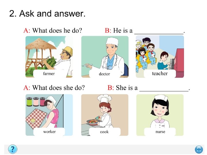 1. Words: grow, farmer, cook, nurse, doctor, worker. 2. Sentences: What does she/he do? She/he is. . . .