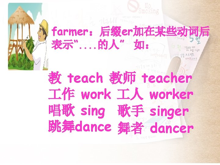 What does he do? farm er ['fɑ: mə(r)] 农民
