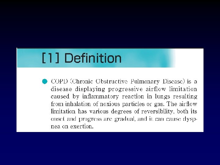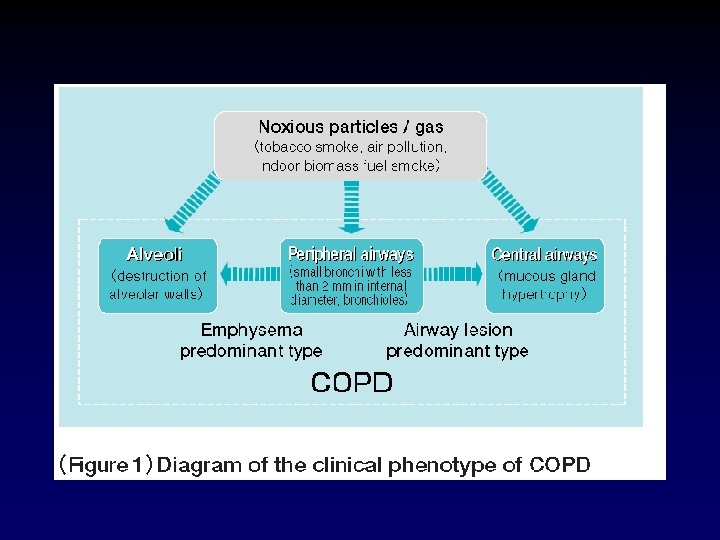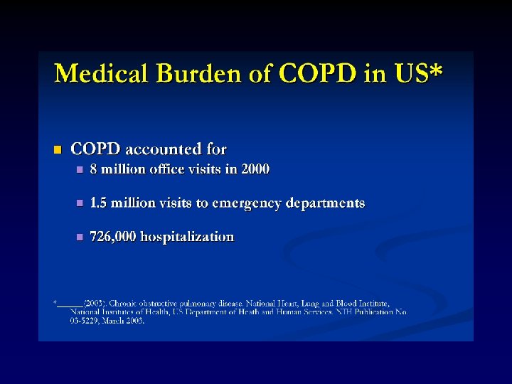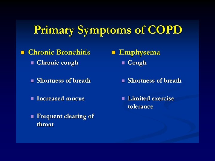 COPD- Definitions • Emphysema – "an anatomical alteration of the lung characterized by an abnormal enlargement of the air-spaces distal to the non-respiratory bronchioles, accompanied by destructive changes of the alveolar walls. " • Chronic Bronchitis – " a clinical disorder characterized by excessive mucus secretion. . . chronic or recurrent productive cough. . . on most days for a minimum of three months in the year for not less than two successive years. "