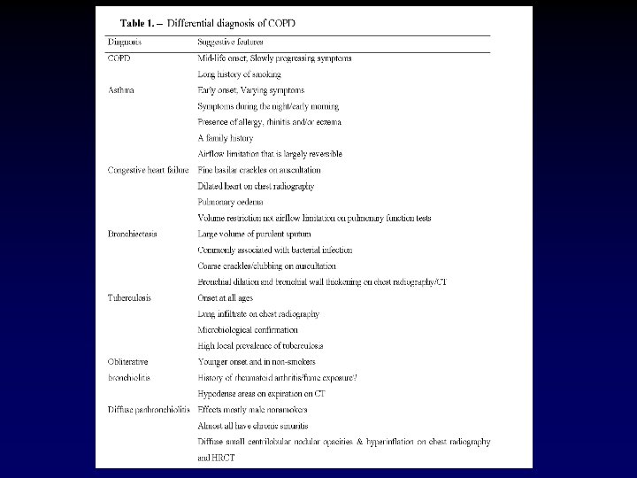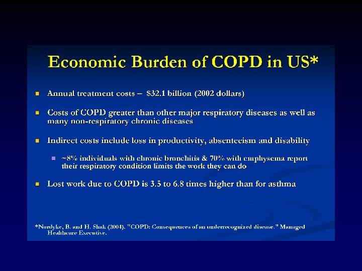 COPD: Risk Factors • Exposures – Smoking (generally ≥ 90%) – Passive smoking – Ambient air pollution – Occupational dust/chemicals – Childhood infections (severe respiratory, viral) – Socioeconomic status • Host factors – Alpha 1 -antitrypsin deficiency (<1%) – Hyperresponsive airways – Lung growth