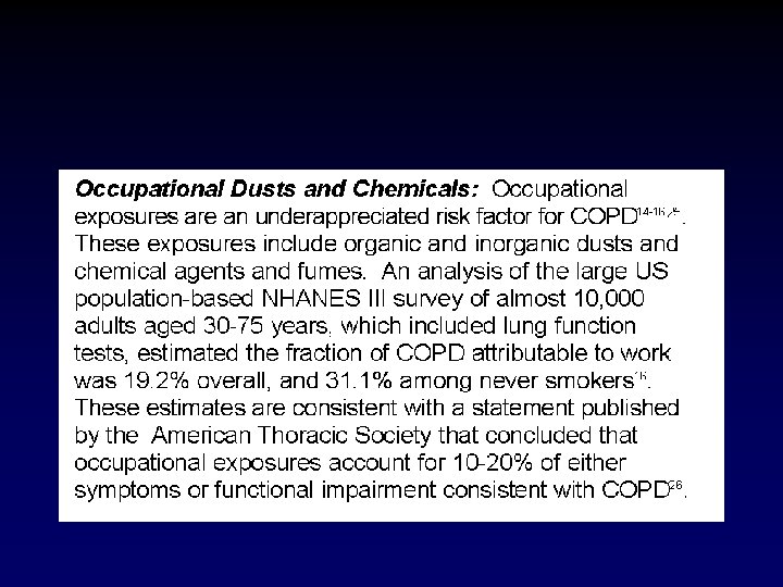 • Most reviewers now accept a causal occupational link and the conditions experienced by workers in several industries over recent decades are considered by many to be similar potency to cigarette smoking