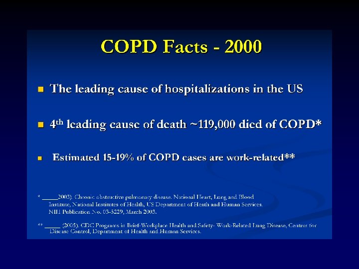 Diagnostic criteria for occupational COPD • Definite confirmation of diagnosis of COPD according to GOLD criteria or ATS criteria – Chronic bronchitis or emphysema or both • Confirmed exposure to one or more occupational etiologic agents – Sufficient exposure ( duration and intensity) – Minimum exposure duration required: • 20 years for coal dust • R/O of antitrypsin deficiency • Least role of cigarette smoking