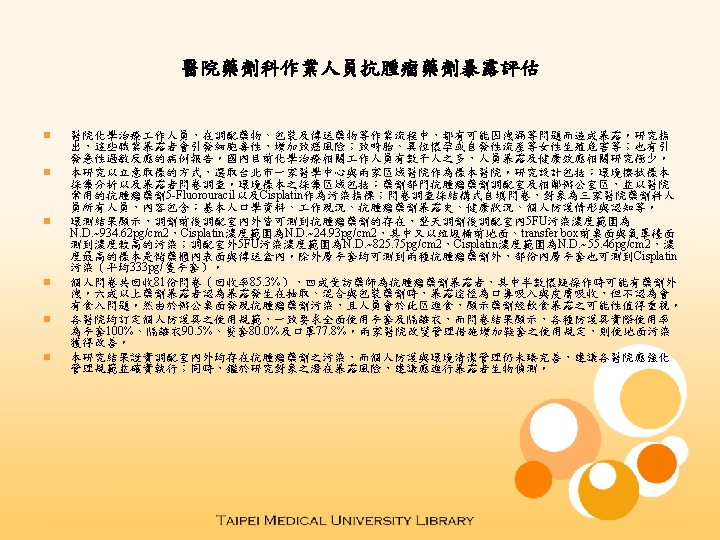 Occupational Exposure to Antineoplastic Agents of Pharmacy Workers in Hospital n n Antineoplastic agents are widely used in hospitals for cancer treatment. Several epidemiological studies found that exposure to antineoplastic agents were associated with reproductive toxic effects, higher rates of advance micronuclei (MN) and sisterchromatic-exchange (SCE), spontaneous abortion, as well as acute allergic reactions. There are thousands of health care workers involving in chemotherapy in Taiwan, but few studies have been conducted to examine the potential health risk related to the use of antineoplastic agents. One medical center and two area hospitals in Taipei, Taiwan were selected to monitor antineoplastic agent levels and to collect exposure background of hospital workers. Surface wipe samples were collected in the pharmacy units and in their adjacent offices in each study hospital. We examined the concentrations of two commonly used antineoplastic agents, 5 Fluorouracil (5 FU) and Cisplatin, in wipe samples and in the disposable protective equipments used in pharmacy units. A self -administered questionnaire was used to collect demographic data, working practices, medical and contact history, and perceived work-related symptoms of staff working in pharmacy units. According to our results, antineoplastic agents were recovered in all of the sampling pharmacy units, including both inside and outside of the administration rooms (inside: 5 FU: N. D. ~934. 62 pg/cm 2, Cisplatin: N. D. ~24. 93 pg/cm 2; outside: 5 FU: N. D. ~825. 75 pg/cm 2, Cisplatin: N. D. ~55. 46 pg/cm 2). We detected antineoplastic agents not only on outer gloves (5 FU: N. D. ~2. 87× 106 pg/gloves, Cisplatin: N. D. ~1. 02× 105 pg/gloves), but also on some of the inner gloves (333 pg/gloves). Among the 81 study pharmacy workers, 40% have been exposed to antineoplastic agents. Half of them suspected that the agents leaked during drug preparation. Although gloves and gown must be worn at all time while handling drug in all of the study hospitals, eye protection, mask, and hair cot were not required. Most subjects recognized the potential exposure to antineoplastic agents through inhalation and dermal contact, but not through ingestion. However, we did detect antineoplastic agents on office tables, indicating potential exposure through contaminated hands or food. In light of extensive antineoplastic agent contamination in pharmacy units, the study hospitals applied improved precaution practices, which resulted in better contamination control. Therefore, better control regulations and procedures should be implemented in hospital pharmacy units to minimize workers’ exposure and health risk.