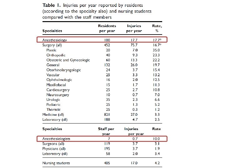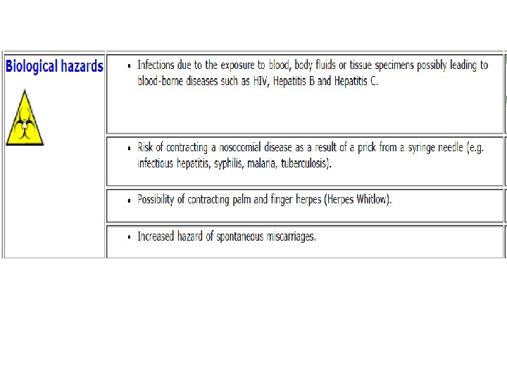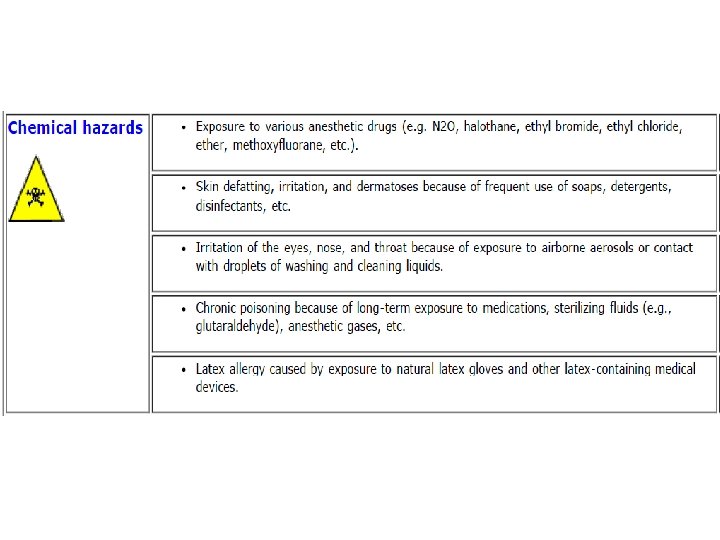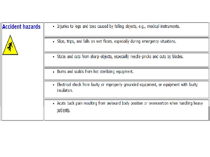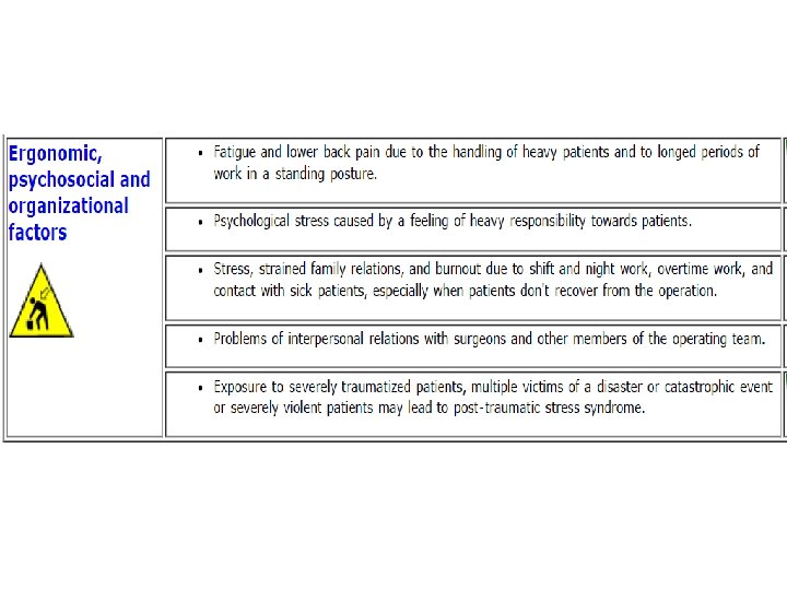 Wear shoes designed for doctors, with non-slip soles. Handle sharp objects with extreme care; use special safety receptacles to store used hypodermic needles until disposal. Use safety needles, if available. Install ground fault circuit interrupters; call a qualified electrician to test and repair faulty or suspect equipment. Comply with all safety instructions regarding the installation and periodic inspection of electrical medical equipment. Wear a radiation badge when exposed to radiation; comply with all safety instructions to reduce exposure to a minimum. Install air conditioning with effective general ventilation in the operating room to reduce heat stress and remove odors, gases, and vapors. Provide eye wash bottles or fountains. Nurses sensitive to natural rubber latex must use non-latex or powder-free latex gloves and avoid contact with other latex products. Follow established appropriate infection control precautions assuming blood, body fluids and tissue are infectious Routinely use barriers (such as gloves, eye protection (goggles or face shields) and gowns) Wash hands and other exposed skin surfaces after coming into contact with blood or body fluids Follow appropriate procedures in handling and disposing of sharp instruments or needles Provide lifting aids for the lifting and transport of heavy patients; consult an occupational safety specialist on the safe handling of heavy patients. Procedures and counselling services should be available to workers exposed to post-traumatic stress syndrome