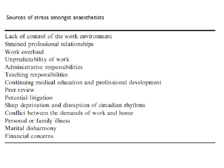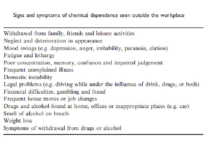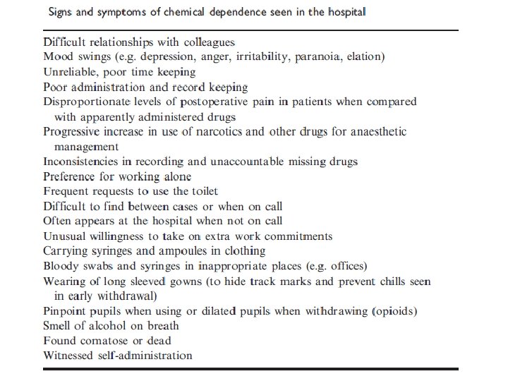 General observed symptoms of depression • • • • Persistently sad, anxious, or empty mood Hopelessness Quietness Aloofness Restlessness, irritability Decreased energy, fatigue Feelings of guilt, worthlessness, helplessness, and failure Loss of interest in hobbies and activities No interest in work-related activities Difficulty concentrating, remembering, making decisions Overeating, or appetite loss Sleep problems Difficulty with interpersonal and/or professional relationships Substance abuse Thoughts of death or suicide; suicide attempts Medical errors: acts of commission or omission