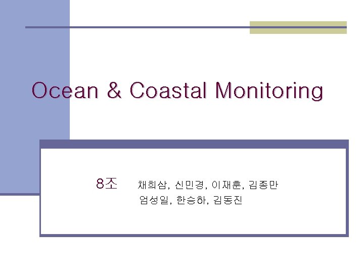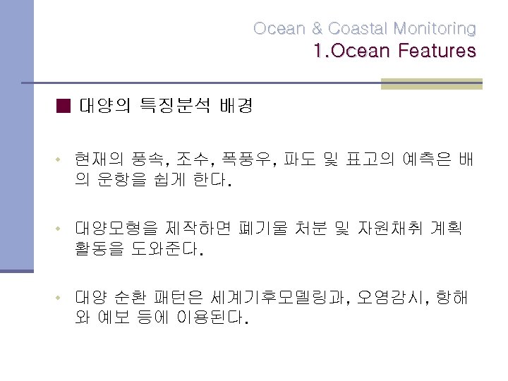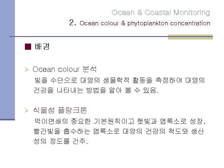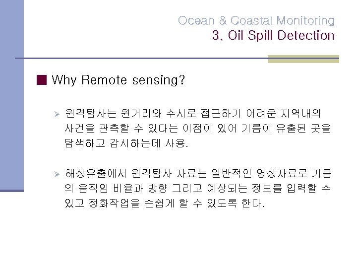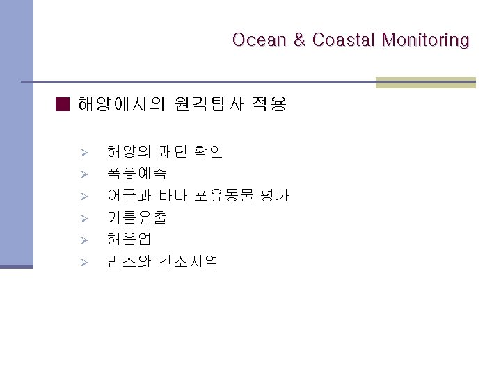 Ocean Coastal Monitoring 1 Ocean Features Ocean Coastal Slides: 12 Download presentation Ocean & Coastal Monitoring 1. Ocean Features Ocean & Coastal Monitoring 1. Ocean Features ■ Why Remote sensing? Ø Scatterometers는 풍속과 풍향 정보를 모으고 고도계로 파고와 풍속을 확인. Ø SAR는 수면의 변화를 scanning radiometers 와 microwave sounder로 바다 표면 온도자료를 모음. Ocean & Coastal Monitoring 2. Ocean colour & phytoplankton concentration Ocean colour Ocean & Coastal Monitoring 3. Oil Spill Detection Oil Spill Ocean & Coastal Monitoring 감사합니다.