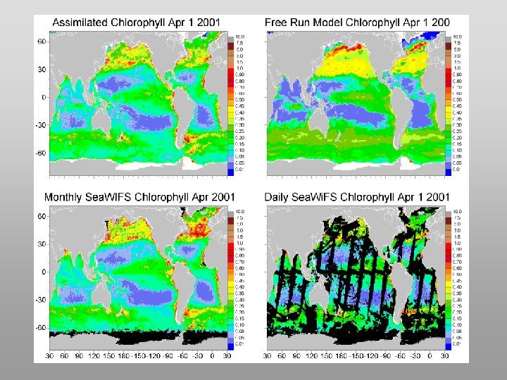 NASA Ocean Biogeochemical Model (NOBM) Dust (Fe) Sea Ice Winds, ozone, relative humidity, pressure, precip. water, clouds (cover, τc), aerosols (τa, ωa, asym) Winds SST Radiative Model (OASIM) Ed(λ) Es(λ) Biogeochemical Processes Model Outputs: IOP Layer Depths Temperature, Layer Depths Advection-diffusion Chlorophyll, Phytoplankton Groups Primary Production Nutrients DOC, DIC, p. CO 2 Spectral Irradiance/Radiance Ed(λ) Es(λ) Circulation Model (Poseidon) Global model grid: domain: 84 S to 72 N 1. 25 lon. , 2/3 lat. 14 layers