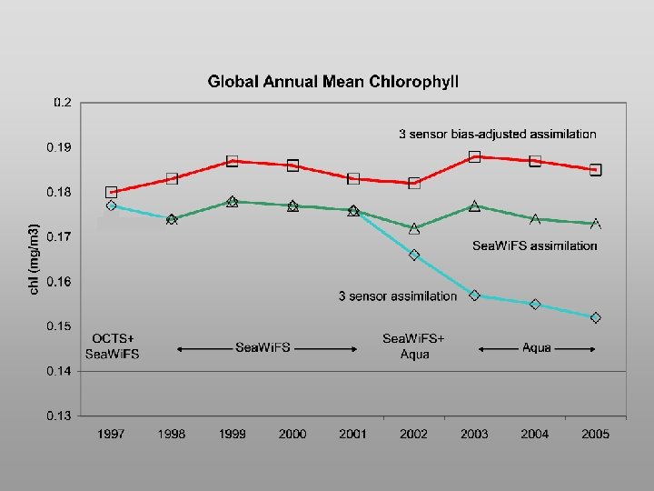 Trends 1998 -2004 Data/Model Sea. Wi. FS NOBM Free Run NOBM assimilation Sea. Wi. FS Linear Annual Trend -0. 71% ns 0. 18% ns -0. 98% ns