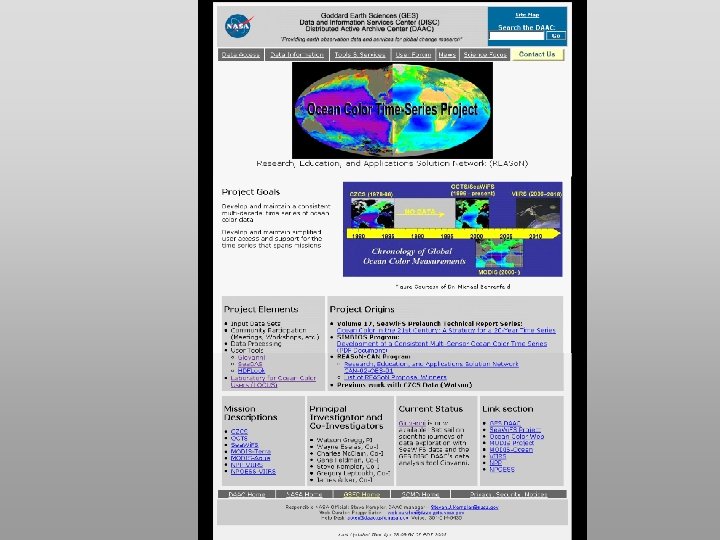 Ocean Color Time Series REASo. N CAN Team: Watson Gregg, NASA/Global Modeling and Assimilation: Oversight, Data Analysis DAAC: Data Access and Visualization, Archival, Distribution Jim Acker, NASA/GES-DAAC Steve Kempler, NASA/GES-DAAC Greg Leptoukh, NASA/GES-DAAC OBPG: Data Processing, In Situ Data Collection, Coincident Data Merging Gene Feldman, NASA/Ocean Color Processing Chuck Mc. Clain, NASA/Ocean Color Processing UCSB: Coincident Data Merging/ Data Technology Jim Frew, Stephane Maritorena, David Siegel