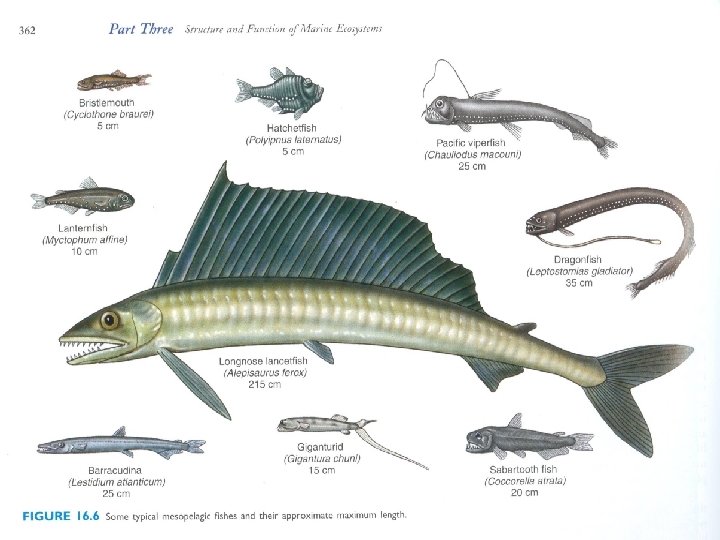 Oceanic Zonation – upper layers • The ocean depths include a number of distinct habitats • The uppermost layer is the epipelagic zone. This is roughly equivalent to the photic zone. (surface – 200 m) • Beneath the epipelagic is the mesopelagic zone – or the middle pelagic – light still penetrates, but not enough for primary productivity. This layer is sometimes called the twilight zone (200 m – 1000 m)