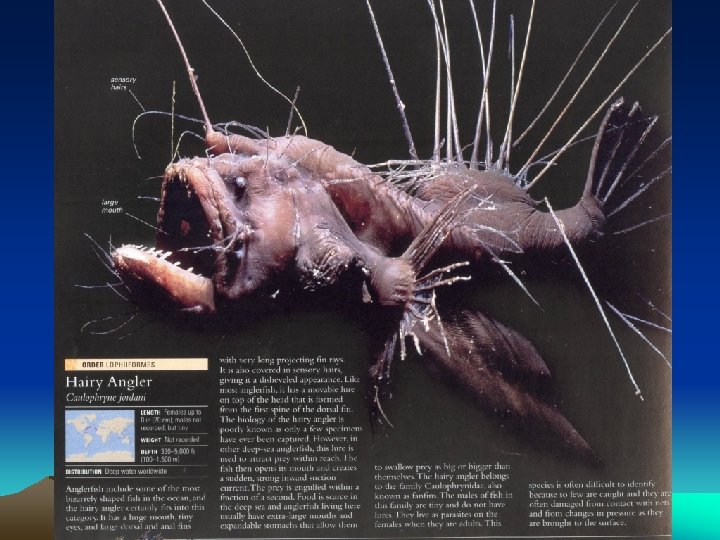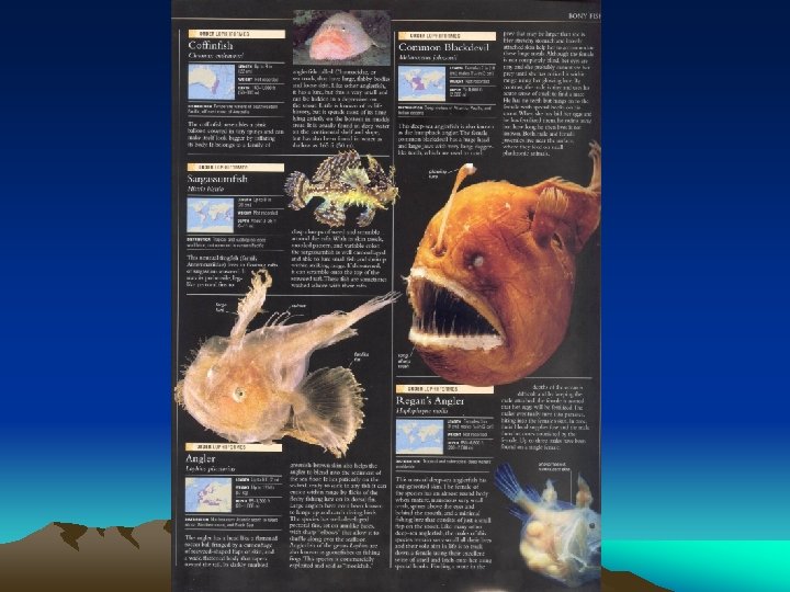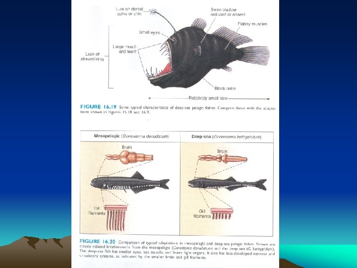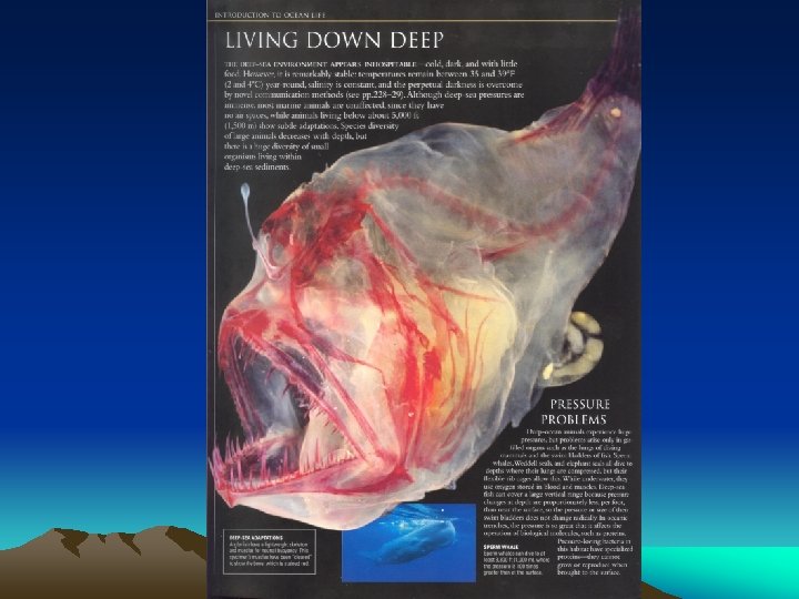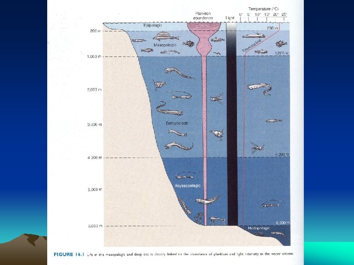 Oceanic Zonation – lower layers • Beneath the upper layers of the epipelagic and the mesopelagic we find the lower layers of the ocean – truly the deep ocean • The bathypelagic zone (1000 m – 4000 m ~ 2. 5 miles) is a world of perpetual darkness • The conditions of life in the deep pelagic environment change very little. Not only is it always dark, it is always cold: 35 degrees F……salinity 35 ppt. • Below the bathypelagic there is the abyssopelagic zone (4000 m – 6000 m ~ 4+ miles) • Below the abyssopelagic zone exists the deepest locations on earth, the hadopelagic zone (6000 m – 11000 m ~ 4+ to 7 miles) • The deepest place on earth is at the Mariana Trench; Challenger Deep in the Pacific ocean (10, 991 m / 36, 061 ft) • Mt. Everest by comparison – the highest point on earth, has a height of 29, 035 ft.