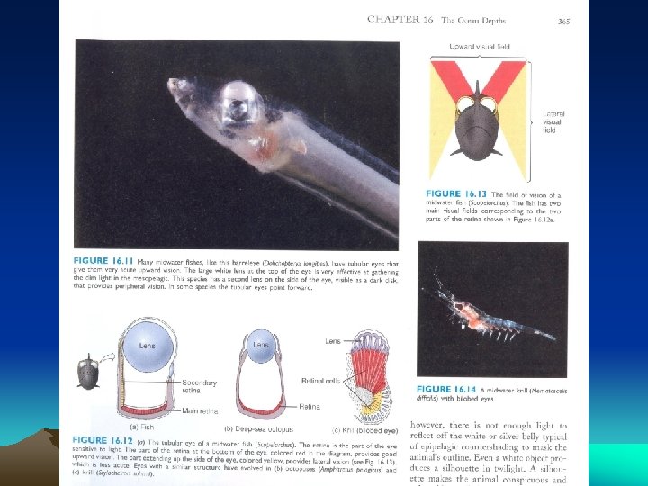 Sense Organs • To help them see in the dim light, midwater fishes characteristically have eyes that are not only large, but unusually sensitive. • Large, light-sensitive eyes also occur in squids, shrimps, and other groups • Some mid-water fish have developed tubular eyes, a complex visual system that is almost like having two pairs of eyes