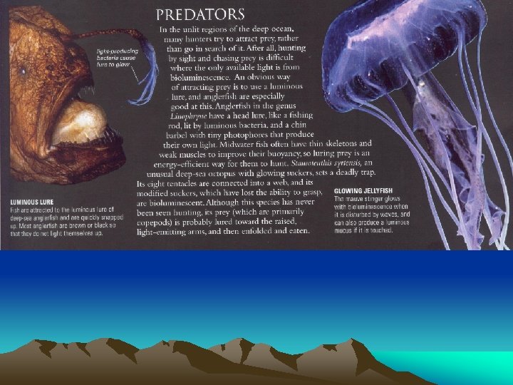 Bioluminescence • Most midwater animals have evolved an even more effective way to mask their silhouettes. • Their bioluminescent photophores, found mostly on their ventral side, produce light that breaks up the silhouette and helps the animal blend in with the background light filtering down from the surface: counter illumination.
