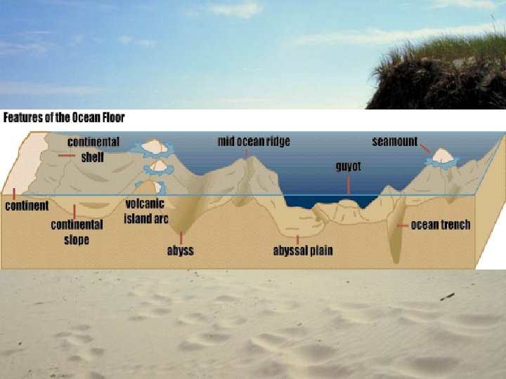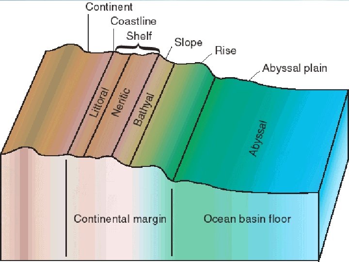 • The ocean basins are characterized by recognizable geologic/topographic features. While the size of each feature may change within the various ocean basins they are always present: