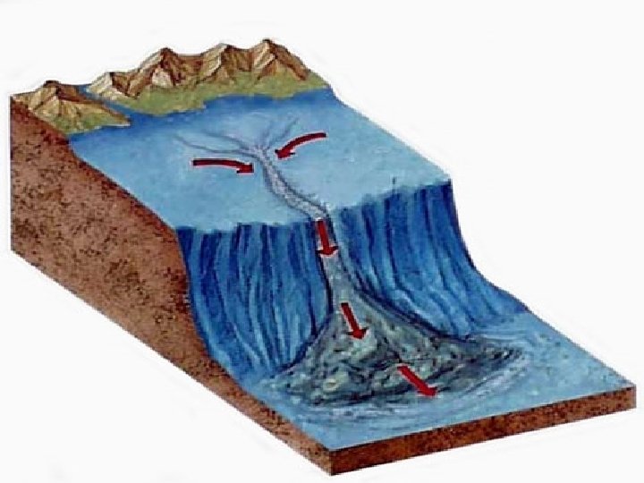 Continental slope • - the continental slope marks the transition between the shelf and deep ocean floor. • It has an average slope of 3 -6°. 100 kilometers water depth increases from 75 meters to 4000 meters.