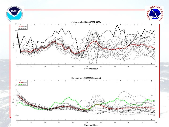 Status of ensemble systems l Old wave ensemble system This system had been operational from May 2005 to May 2008. Running on old deterministic global model grid (1. 25°× 1°) as the control 10 wave members generated through GEFS using the breeding method. Same initial conditions for all members. 5 day (126 h) forecast. Wind data: raw wind data