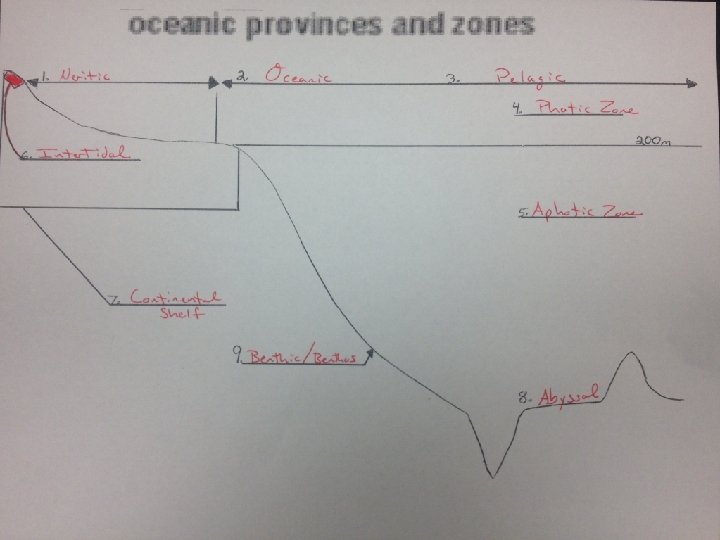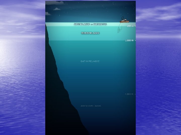 Division by light levels • Photic – light • Euphotic – upper 200 meters – Majority of life and economic activity • Aphotic – aka midnight zone