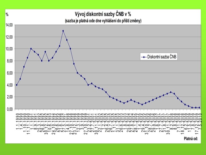 Vývoj diskontní sazby ČNB v % (sazba je platná ode dne vyhlášení do příští změny) Platná od: % 23. 12. 1998 7, 50 28. 1. 2005 1, 25 1. 10. 2012 0, 10 1. 1. 1990 4, 00 12. 3. 1999 6, 00 1. 4. 2005 1, 00 2. 11. 2012 0, 05 1. 4. 1990 5, 00 3. 9. 1999 5, 50 29. 4. 2005 0, 75 1. 10. 1990 7, 00 27. 10. 1999 5, 00 31. 10. 2005 1, 00 11. 1990 8, 50 23. 2. 2001 4, 00 28. 7. 2006 1, 25 1. 1. 1991 10, 00 27. 7. 2001 4, 25 29. 9. 2006 1, 50 8. 9. 1991 9, 50 30. 11. 2001 3, 75 1. 6. 2007 1, 75 25. 3. 1992 9, 00 22. 1. 2002 3, 50 27. 7. 2007 2, 00 26. 8. 1992 8, 00 1. 2. 2002 3, 25 31. 8. 2007 2, 25 30. 12. 1992 9, 50 26. 4. 2002 2, 75 30. 11. 2007 2, 50 10. 6. 1993 8, 00 26. 7. 2002 2, 00 8. 2. 2008 2, 75 24. 10. 1994 8, 50 1. 11. 2002 1, 75 8. 8. 2008 2, 50 26. 6. 1995 9, 50 31. 1. 2003 1, 50 7. 11. 2008 1, 75 21. 6. 1996 10, 50 26. 6. 2003 1, 25 18. 12. 2008 1, 25 27. 5. 1997 13, 00 1. 8. 2003 1, 00 6. 2. 2009 0, 75 14. 8. 1998 11, 50 25. 6. 2004 1, 25 11. 5. 2009 0, 50 říjen 2018 27. 10. 1998 10, 00 27. 8. 2004 1, 50 7. 8. 2009 0, 25 2, 50 % Lombardní sazba
