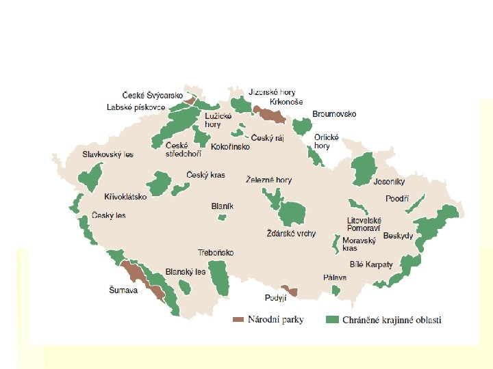 Národní parky § Rozsáhlá území, jedinečná v národním či mezinárodním měřítku, jejichž značnou část zaujímají přirozené nebo lidskou činností málo ovlivněné ekosystémy, v nichž rostliny, živočichové a neživá příroda mají mimořádný vědecký a výchovný význam, lze vyhlásit za národní parky. § Národní parky, jejich poslání a bližší ochranné podmínky se vyhlašují zákonem 1963 – KRNAP – dnešní podoba dána nařízením vlády z roku 1991 + od roku 1992 – biosférická rezervace NP 36 334 ha (z toho 1. zóna NP: 4 508 ha, 12%) + OP 18 278 ha 1991 – NP Podyjí 6 275 ha (1. zóna 35 %) + OP 2 200 ha (od 1978 CHKO) 1991 – NP Šumava 68 584 ha (1. zóna 13 %) – OP není* 2000 – NP České Švýcarsko 7 926 ha (od 1972 CHKO)