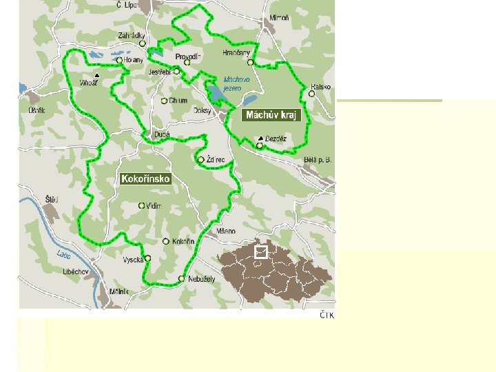 CHKO Kokořínsko – Máchův kraj § nejnověji vyhlášené velkoplošné chráněné území § vyhlášena nařízením vlády ze dne 9. dubna 2014 s účinností od 1. září 2014 § skládá se: 2 nespojité územní celky: § část Kokořínsko (274 km 2, původní část, tak jak byla vyhlášena v roce 1976, s rozšířením u Dolanského rybníka) § část Máchův kraj (136 km 2, zcela nově vymezené dosud nechráněné území Dokeska)